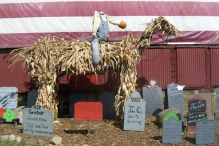 I took a vacation day today to buy my fall decor and get the house ready for Halloween and Autumn. It was a perfect fall day; high 60s and sunny. My first stop was Petitti’s in Tallmadge for mums and flowering kale. Next was Dussel’s Farm in Brimfield just around the corner from us. It was delightful. I was one of the only people shopping. On fall weekends, Dussel’s become a madhouse of families and children. Check out the photos below. Dussel’s does a nice job of adding to their Halloween decor each year. The haunter rock band and bus is new this year along with the Obama and McCain scarecrows.