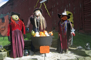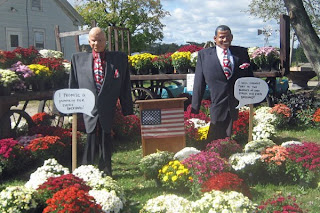 I took a vacation day today to buy my fall decor and get the house ready for Halloween and Autumn. It was a perfect fall day; high 60s and sunny. My first stop was Petitti’s in Tallmadge for mums and flowering kale. Next was Dussel’s Farm in Brimfield just around the corner from us. It was delightful. I was one of the only people shopping. On fall weekends, Dussel’s become a madhouse of families and children. Check out the photos below. Dussel’s does a nice job of adding to their Halloween decor each year. The haunter rock band and bus is new this year along with the Obama and McCain scarecrows.