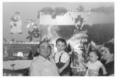 I am the little guy in this Christmas 1955 photo. I chose this photo since it reminds me of one of my fondest Christmas memory. My dad was very artistic. Every Christmas he decorated our living room mantle to the max. You can catch a glimpse of it in the background. We had a small 1950s brick ranch. The house had a large picture window in the living room. Along with the mantle, this window was decorated to the max. My dad was a master of spray snow! Does anyone else remember the snow and the templates you held over the glass to create holiday shapes? I wonder if that product is still being sold? He used it liberally on the mantle mirror and living room picture window. My dad loved Christmas and put a lot of effort into making our home very Christmas-like. Merry Christmas to all on this beautiful Christmas Day in Ohio!