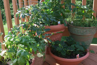 It’s been a rainy few weeks here in Ohio. On Memorial Day weekend, I planted a deck garden of vegetables and herbs in mismatched pots. They have just exploded in growth. I’ve already been harvesting parsley, basil and cilantro. Check out the small tomatoes on the vine already.
